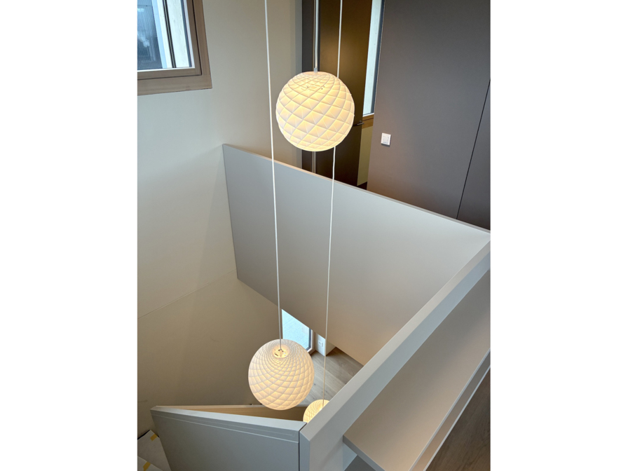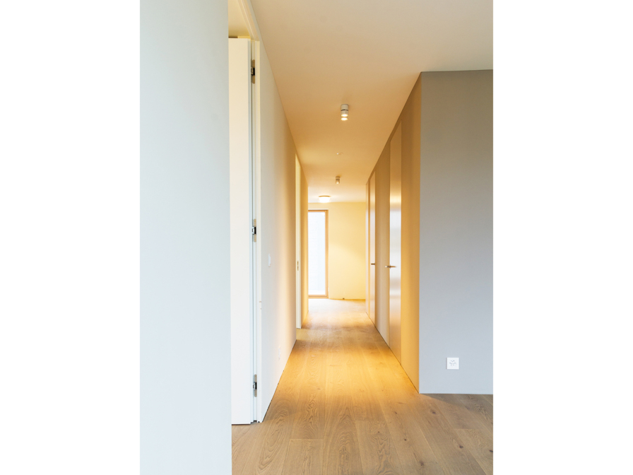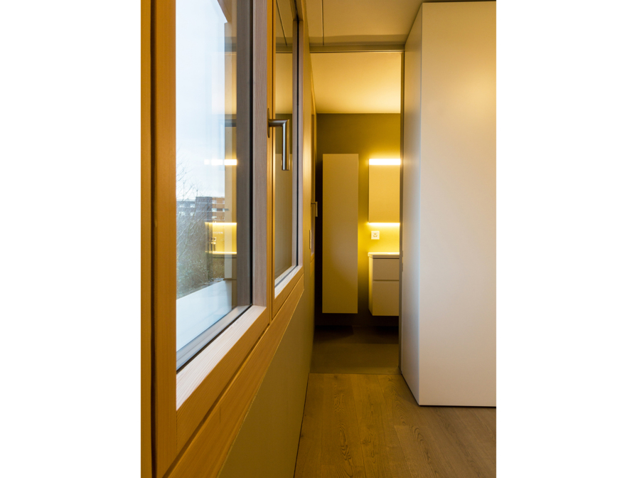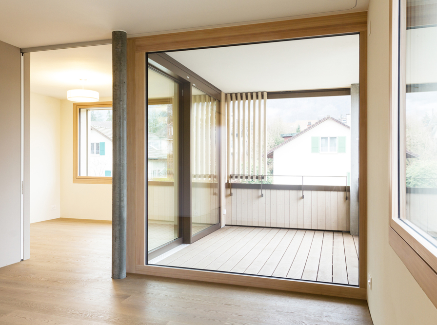 Die drei Wohngeschosse verfügen über unterschiedliche Qualitäten. Im Erdgeschoss entsteht eine grosszügige Einlieger-Familienwohnung mit direktem Gartenzugang. Das mittlere Geschoss ist direkt über die Aussentreppe erschlossen und beherbergt sämtliche Zimmer, die um einen zentralen Kern angeordnet sind. Das oberste Geschoss schliesslich besteht aus einem stützenlosen Raum als Wohn- und Essbereich der Bauherrschaft, welcher sich auf die Attikaterrasse öffnet sowie von der Fernsicht bis zur Jurakette profitiert. Auf jedem der 3 Geschosse erweitert jeweils Über-Eck eine grosszügige Veranda als geschütztes Aussenzimmer den Wohn- und Essbereich. Der Garten wird gemeinsam genutzt und mit einem weiteren Sitzplatz ergänzt.