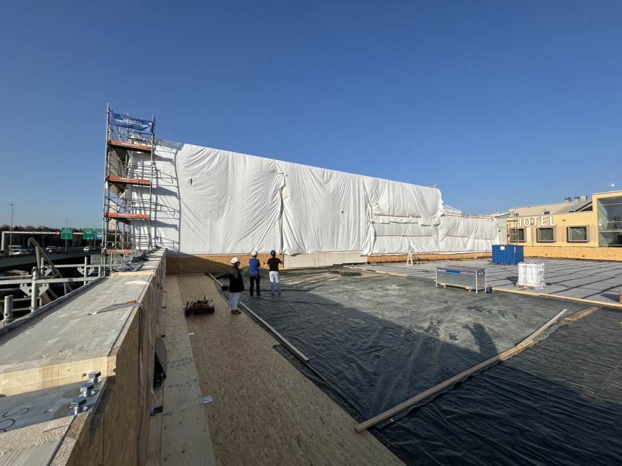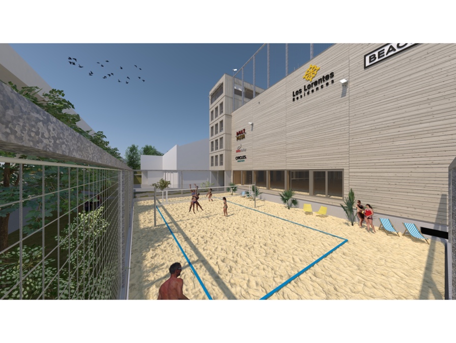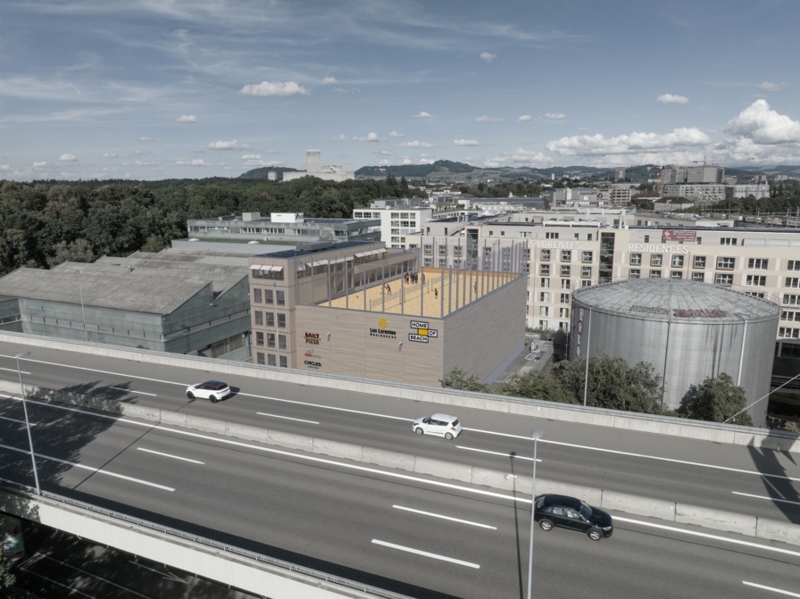 Das Projekt sieht einen Baukörper vor, welcher die Parzelle optimal verdichtet nutzt und der entlang der nördlichen Strasse rund 22 Meter hoch ist. In diesem Volumen sind die Garderoben, die Gastronomie, die Verwaltungs- und Mantelnutzungsräume sowie die Erschliessungskerne (Treppenhaus und Lift) untergebracht. Südlich davon befindet sich die Beachsporthalle mit vier Indoorfeldern und vier Aussenfeldern auf dem Dach für den Sommerbetrieb. In westlicher Richtung (zum Viaduktraum) vorgelagert entsteht ein weiteres Aussenbeachsportfeld. Dieses dient der Adressbildung und soll einen attraktiven und nahtlosen Übergang zum Viaduktraum und dessen Sport- und Kulturnutzungen schaffen.