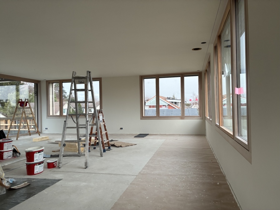 Die drei Wohngeschosse verfügen über unterschiedliche Qualitäten. Im Erdgeschoss entsteht eine grosszügige Einlieger-Familienwohnung mit direktem Gartenzugang. Das mittlere Geschoss ist direkt über die Aussentreppe erschlossen und beherbergt sämtliche Zimmer, die um einen zentralen Kern angeordnet sind. Das oberste Geschoss schliesslich besteht aus einem stützenlosen Raum als Wohn- und Essbereich der Bauherrschaft, welcher sich auf die Attikaterrasse öffnet sowie von der Fernsicht bis zur Jurakette profitiert. Auf jedem der 3 Geschosse erweitert jeweils Über-Eck eine grosszügige Veranda als geschütztes Aussenzimmer den Wohn- und Essbereich. Der Garten wird gemeinsam genutzt und mit einem weiteren Sitzplatz ergänzt.