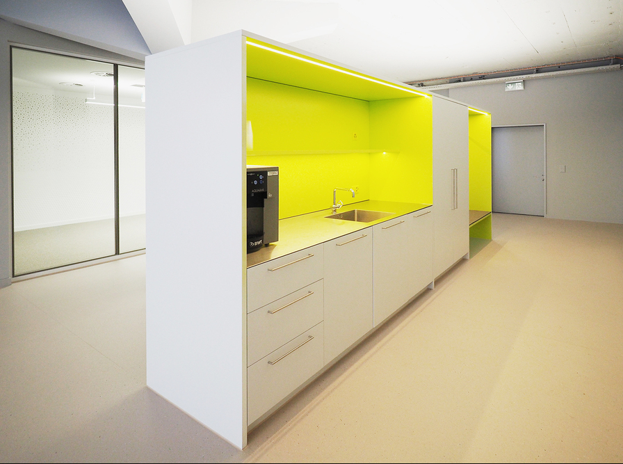 Die Servicemöbel wie Garderobe und Teeküche mit Aufenthaltsbereich ergänzen den Arbeitsbereich.