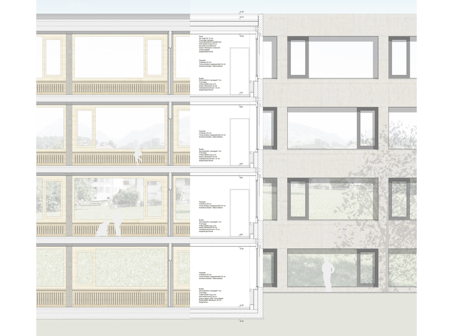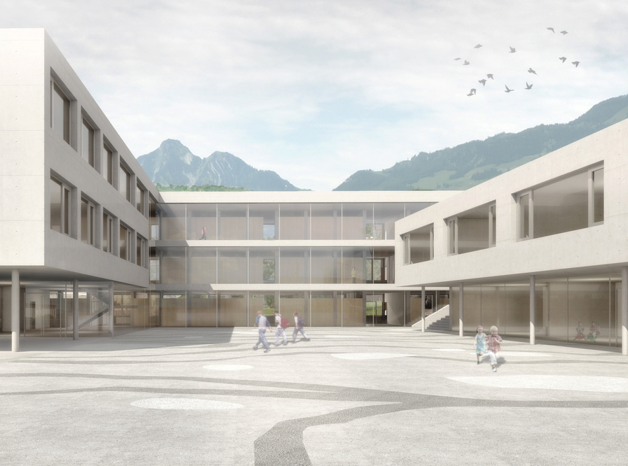 Der kompakte Hofneubau nimmt in seiner Grösse Bezug zu den bestehenden Schulbauten und bildet den östlichen Abschluss der Gesamtanlage. Durch das leichte Ausdrehen aus der Orthogonalität fügt sich der Schulhausneubau selbstverständlich in den städtebaulichen Kontext ein und öffnet sich gegen Westen zur bestehenden Gesamtanlage. Die volumetrisch einfachen Flachdachbauten verstärken die Eigenständigkeit der Anlage und grenzen sich damit von den traditionellen Bauformen des historischen Dorfkerns ab.