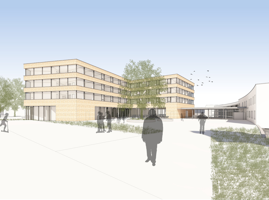 Die volumetrisch freie Form des Neubaus entsteht aus einer Symbiose von situativer Einpassung, qualitätsvoller Gestaltung der Pflegewohngruppen und optischer Verkürzung der Gebäudelängen durch Abdrehen der Fassadenfluchten. Das Raumprogramm wird in drei Wohnstationen in den Obergeschossen und in allgemein zudienende und versorgende Räume im Erdgeschoss aufgeteilt. In der Eingangshalle teilen sich die Besucherwege Richtung Pflegeheim, externe Dienstleistungen und in das Wohngebäude. Die einzelnen Zugänge sind bewusst als Tordurchgänge ablesbar ausgebildet.