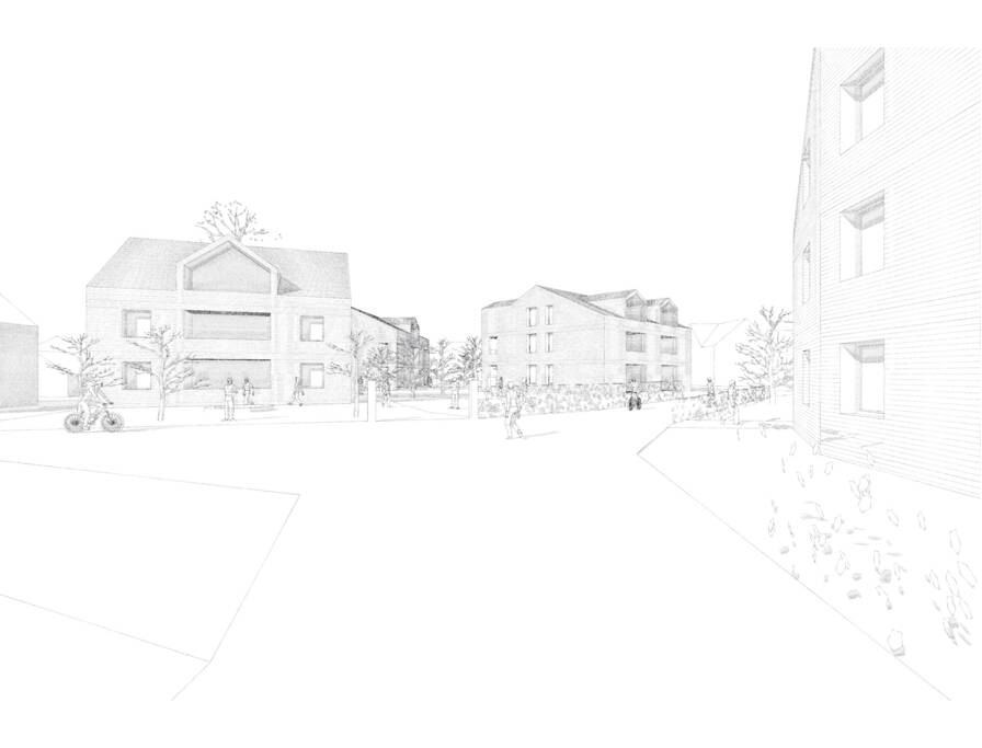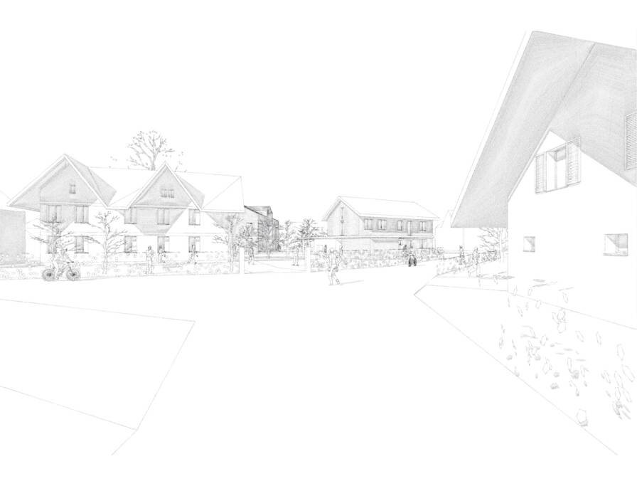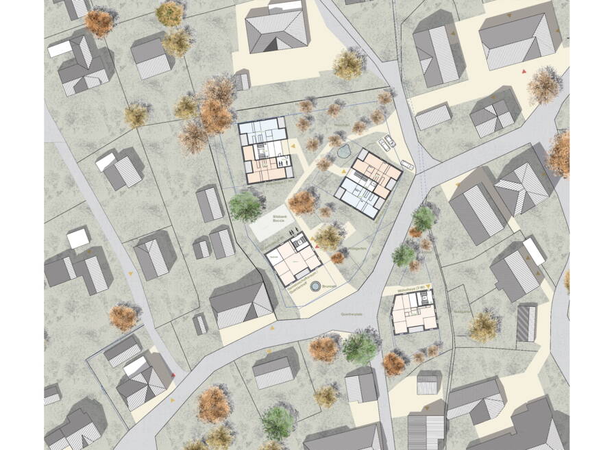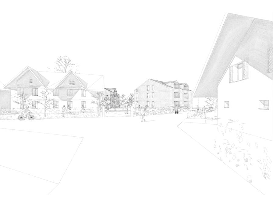 Die vier Neubauten (7+6+4+3 Wohnungen) schaffen klar definierte neue Räume: Die Ersatzneubauten der älterenGebäude Nr. 11 und 14 öffnen sich zur Kirchstrasse und spannen einen Quartierplatz auf. Körnung und Dichte der projektierten Überbauung gliedern sich optimal in die heterogen gewachsene Umgebung ein.Der sensible Umgang mit der Nähe zur Kirche ist Bestandteil des Konzepts. Die versetzte Anordnung der punktförmigen Bauten mit internem Erschliessungsweg schafft Ost-West orientierte Wohnungen. Über einen Zugangsweg gelangt man auf den flexibel bespielbaren Freiplatz im Zentrum, an welchen auch die Gemeinschaftsräume angegliedert sind. Von hier aus wird ein Wegnetz aufgespannt, welches zu den einzelnen Gebäudeeingängen führt. Die Hoschtet und der Nutzgarten führen die bestehende Typologie der Freiraumstruktur weiter. Holzdecks schaffen einen Niveausprung vom privaten Freibereich im Erdgeschoss hin zum gemeinschaftlichen Aussenbereich. Der Übergang von Privatheit über halbprivate Bereiche hin zu öffentlichen Zonen ist fliessend. Eine vielfältige Bespielbarkeit der Aussenbereiche wird dadurch gefördert.